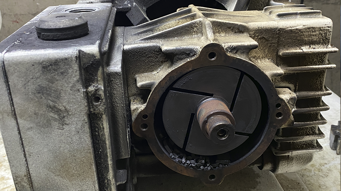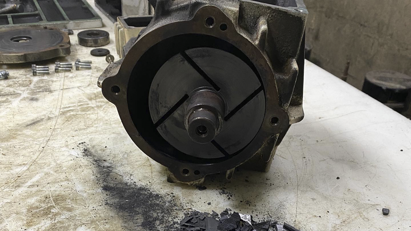 Veja a baixo fotos da palheta de grafite completamente quebrada, com alto nível de dano, possivelmente causado por erro de operação ou falta de manutenções preventiva.